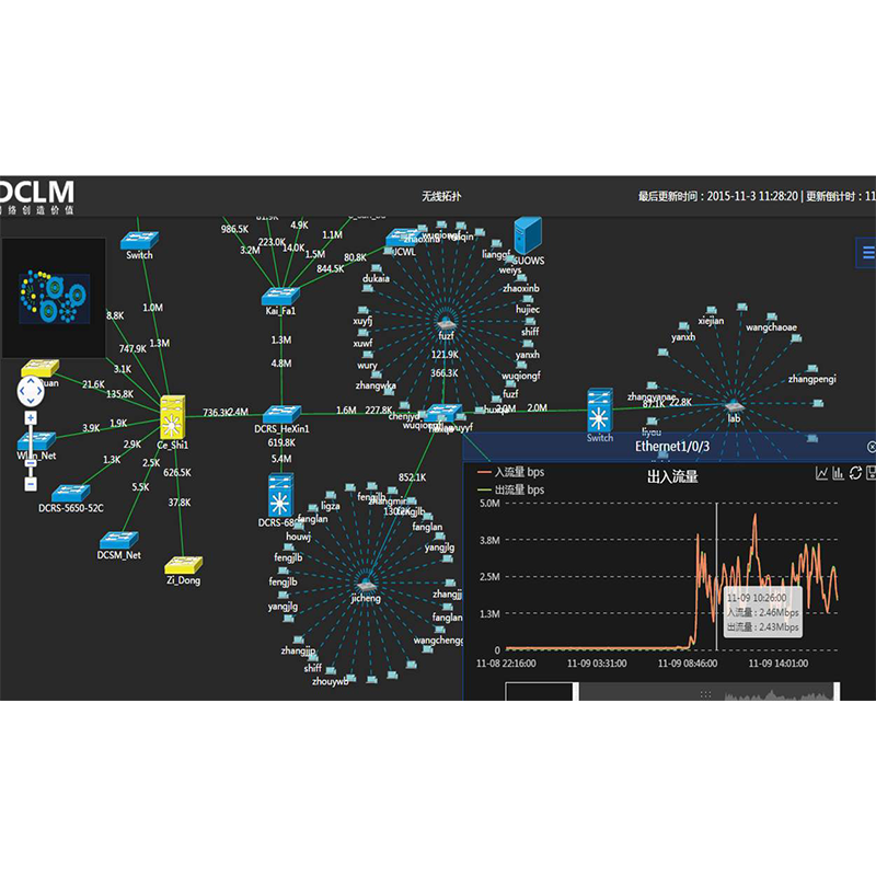 系统支持自动发现设备的物理连接关系,并且也支持手动建立连接关系,支持拓扑设备自动合理布局。拓扑中实时显示设备的状态和链路流量等信息,支持告警信息的实时展现提醒,支持上传拓扑背景图片,用户可以根据自己的需要自定义属于自己的拓扑展现。