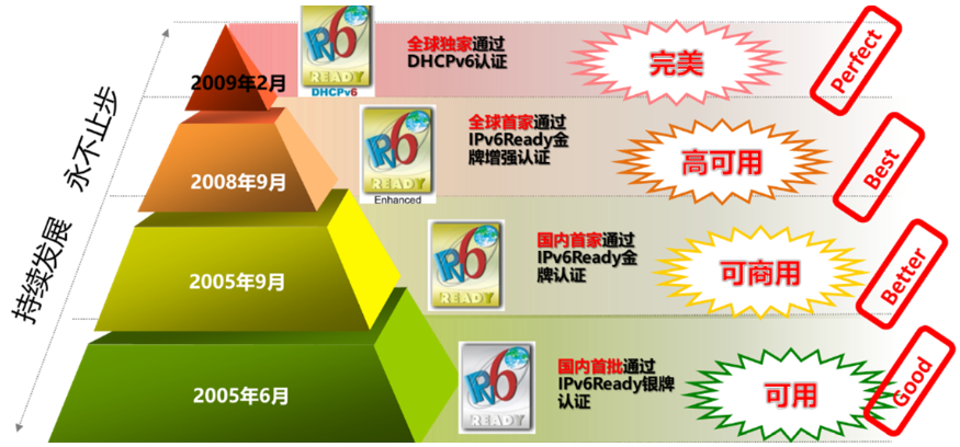 OB视讯集团是国内首个顺利获得IPv6 Ready Phase2 认证的网络厂商,也是全球首个顺利获得IPv6 Ready Phase2 Enhance认证的网络厂商,还是全球最早顺利获得DHCPv6认证的网络厂商。
